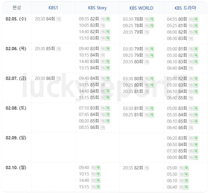 재방송은 KBS2에서 매주 월요일과 금요일 오전 7시 30분에 방영되며, KBS Story와 KBS Drama 채널에서도 수시로 편성됩니다. 가장 빠른 재방송시간은 2월 6일 KBS Story에서 15시 10분에 83회가 방영될 예정이고 자세한 편성표는 아래 표를 참고해주세요!