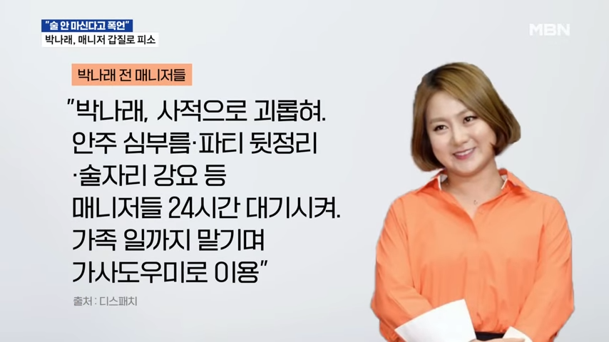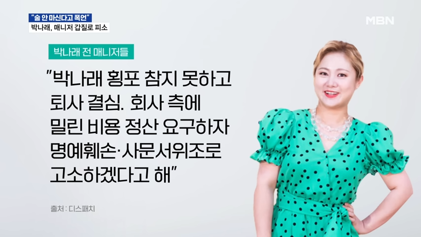 더욱 문제가 되는 부분은 박나래가 운영하던 소속사가 대중문화예술기획업 미등록 상태였다는 점입니다. 박나래는 당시 신청을 진행 중이라고 해명했지만, 이미 매니저들을 고용해서 활동하고 있었다는 점이 지적되고 있습니다. 즉, 법적으로 등록되지 않은 소속사 아래에서 매니저들을 관리했다는 뜻인 것이에요. 매니저들이 정산을 요구했을 때 박나래 측은 "명예훼손과 사문서위조로 고소하겠다"는 답변만 돌려줬다고 하네요.