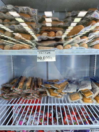 매점에는 라면, 과자, 아이스크림, 술, 음료, 고기, 버섯 등이 팔았어요.